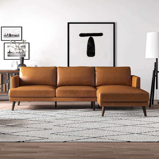 L-Shaped Genuine Leather Sectional in Tan - Mid Century Modern